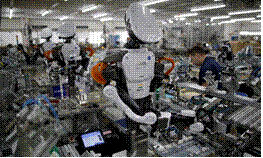 日本加须市,人形机器人与员工在装配线上并肩工作