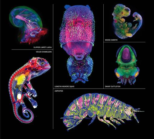 在马萨诸塞州伍兹霍尔研究所的海洋生物实验室里,学生们用不同的着色剂对动物胚胎进行了处理,多细胞的特性使得复杂结构和特殊组织能够在动物胚胎中被不同着色剂显示出来(见封二)