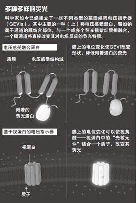 到了90年代,研究者开始尝试能够通过基因工程技术表达于特定神经元的指示器。第一个基因编码电压指示器(geneticallyencodedvoltageindicator,GEVI)于1997年问世,这之后,许多研究者如法炮制,研发得到了超过20种传感器。其中有些是通过将电压敏感蛋白同荧光分子相结合(见上图“多种多样的荧光”)。当这些蛋白在检测到电位变化后,三维结构发生变化,结合分子的荧光进而发生变化。另一种传感器则是微生物视紫红质的突变体,这是一种在光照条件下可使质膜电位发生变化的荧光分子。它也可以反其道而行之,在膜电位变化时,改变其荧光。