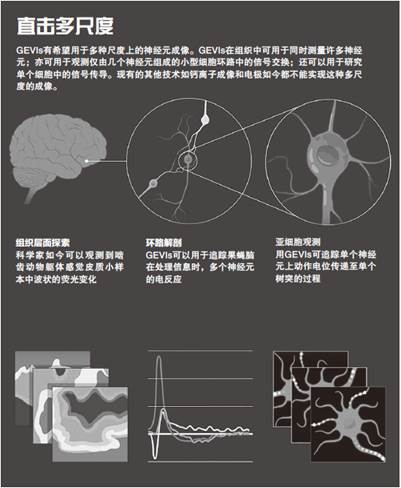 GEVIs的另一个优势在于,它不同于电极主要从细胞胞体处记录,而能够从神经细胞的任意部位记录电信号,从胞体一直到树突末端(见下图“直击多尺度”)。这如同是能够直接听见钢琴家左手弹奏的音符。“这是我多年来的梦想,自然我也绝非一人,”加拿大魁北克省拉瓦尔大学的神经生物学家凯特琳·托斯(Katalin Toth)说,“许多神经科学家都努力通过追踪神经元整体的电压变化,来研究电压在细胞不同区域内的变化。”