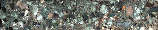 希克苏鲁伯陨石坑核心部分,这种岩石名为冲击凝灰角砾岩,其中含有岩石碎片和熔岩