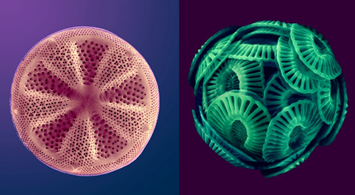 浮游生物的扫描电子显微镜图像(左为硅藻,右为球虫)。不同的浮游生物有不同的气候偏好,这使得它们成为海洋表面状况的理想指标