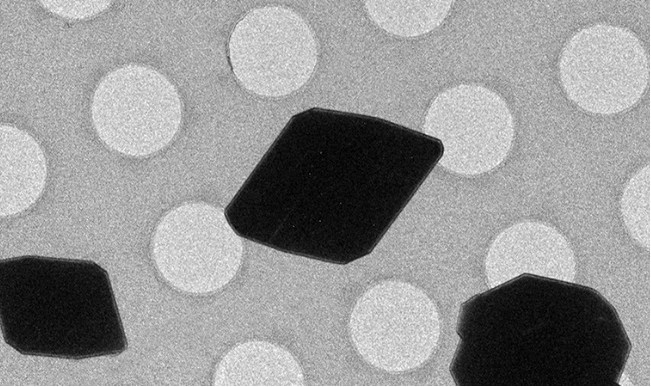 电子显微镜载片上看到的分子结构。如今科学家可以利用微米大小的晶体(黑色)来确定分子结构