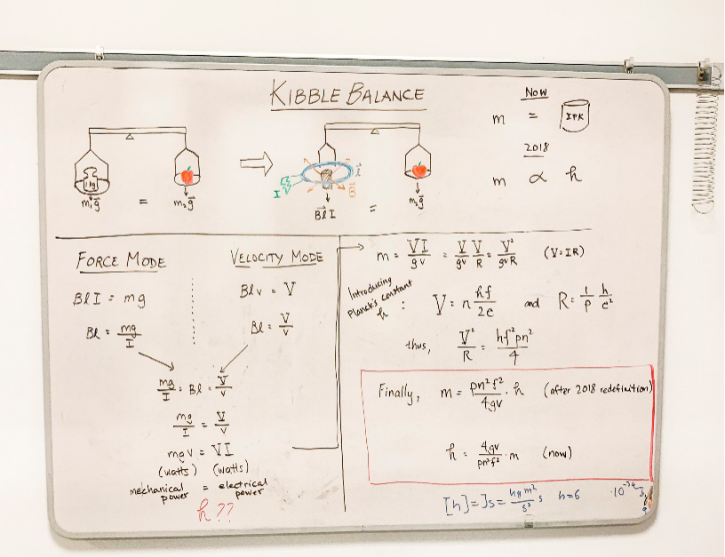 基布尔秤让质量与电磁能等同的公式是很复杂的,NIST的科学家领我到白板面前,向我解释了一遍。