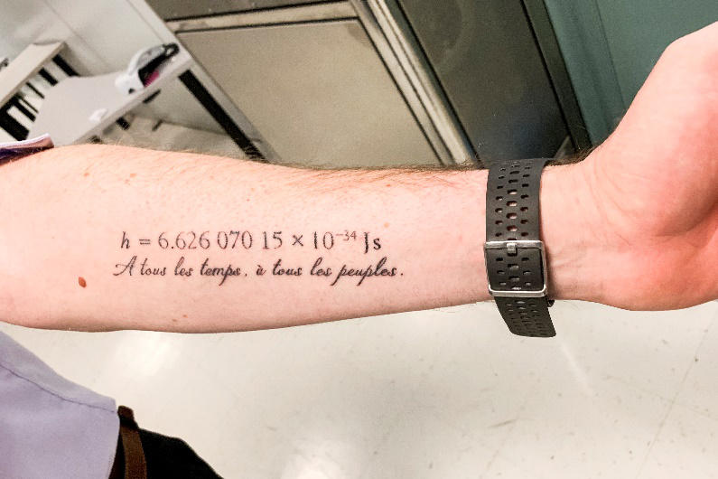 斯特凡·施拉明格尔的普朗克常数文身后面跟着米制的创立格言“适用于所有时候和所有人”