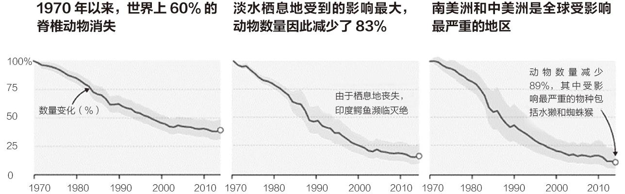 野生动物消失的最大原因是自然栖息地遭到破坏,其中很大一部分是被用于开垦农田,地球上3/4的土地现在都受到人类活动的严重影响。其次是因为人类为获取食物而进行杀戮:300种哺乳动物正在因被吃掉而濒临灭绝,海洋也被过度捕捞,其中工业化捕捞活动遍及一半以上的海洋。