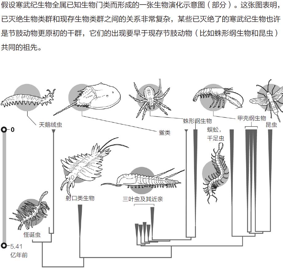 当代古生物学家则选定了另一条理解寒武纪生物的道路。节肢动物大概是地球上最为成功的生物。在生物演化树中,许多分支都会在尚未灭绝的节肢动物(比如蛛形纲生物、昆虫、甲壳纲动物)这里结束。这些节肢动物组成了生命演化树上的“树冠”部分(称为“冠群”)。然而,部分布尔吉斯页岩中的生物很可能来自分化出这些树冠的“树干”部分(称为“干群”)。演化树上的这些分支留下的后代都灭绝了,就像一位在家族大合照中露齿而笑却没有子嗣的叔祖父。从这个角度上说,古尔德笔下的“奇妙生命”是属于树干部分的生物,尽管它们不是现今生物的直系祖先,但仍和它们的直系祖先有亲缘关系。从加拿大洛基山脉中发掘出来的更新一些的化石证据也支持这一观点。例如,卡隆就在2015年辩称,他的那些怪诞虫标本的特征表明,这种生物应该属于天鹅绒虫那一脉生物演化树的树干部分。而天鹅绒虫至今仍生活在热带雨林中,以喷射黏液的方式猎捕食物。