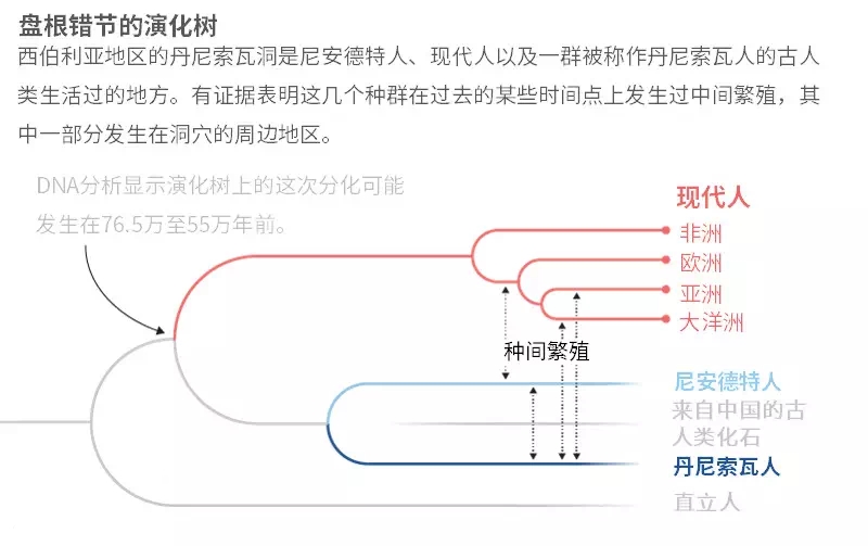 不过更多的材料正在慢慢涌现。2016年,考古学家在丹尼索瓦洞里挖掘到了一大块碎裂不久的顶骨(头骨的一部分),它里面含有丹尼索瓦人的线粒体DNA。这块骨头的形状和直立人(一个古人类物种)身上的同一部位有点相像。大部分研究者都认为直立人是尼安德特人在演化上关系较近的祖先,现在丹尼索瓦人很可能也要加入进来(详见“盘根错节的演化树”一图)。“很遗憾,这块骨头提供的信息量并不大。我原本对它有更多期待。”维奥拉说道,他将在美国体质人类学家协会的年会上描述自己的分析。维奥拉希望能很快找到顶骨的其他碎片,甚至一具完整的头骨。“多一点化石就好了。”他补充说。