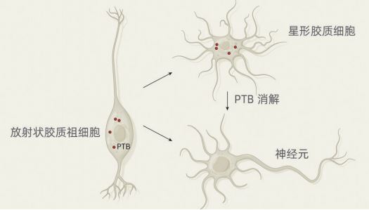 星形胶质细胞向神经元转化的路径。放射状胶质祖细胞是干细胞样细胞,在发育的小鼠中脑里表达着编码PTB蛋白的信使RNA。它们可产生神经元,也可分化出星形胶质细胞这样的非神经元细胞,但星形胶质细胞只有在没了PTB之后才能转化为神经元
