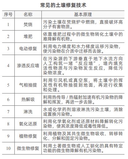 一旦土壤所受污染超过了其自净能力,土壤的功能就受到了破坏,当污染程度达到一定风险水平时,就需要对污染土壤进行治理。经过几十年的发展,多达数十种土壤修复技术涌现了出来,下表举例介绍了几种常用的土壤修复技术。