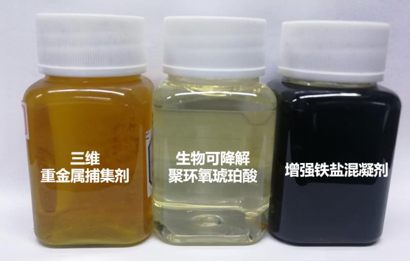 不同的净水剂:左侧三维树枝状聚合物 已广泛用于重金属废水和垃圾飞灰的稳 定处理;中间交联型生物可降解聚环氧 琥珀酸用于循环冷却水污垢的分散;右 侧的复合铁盐混凝剂已广泛用于钢铁、 市政等污水处理