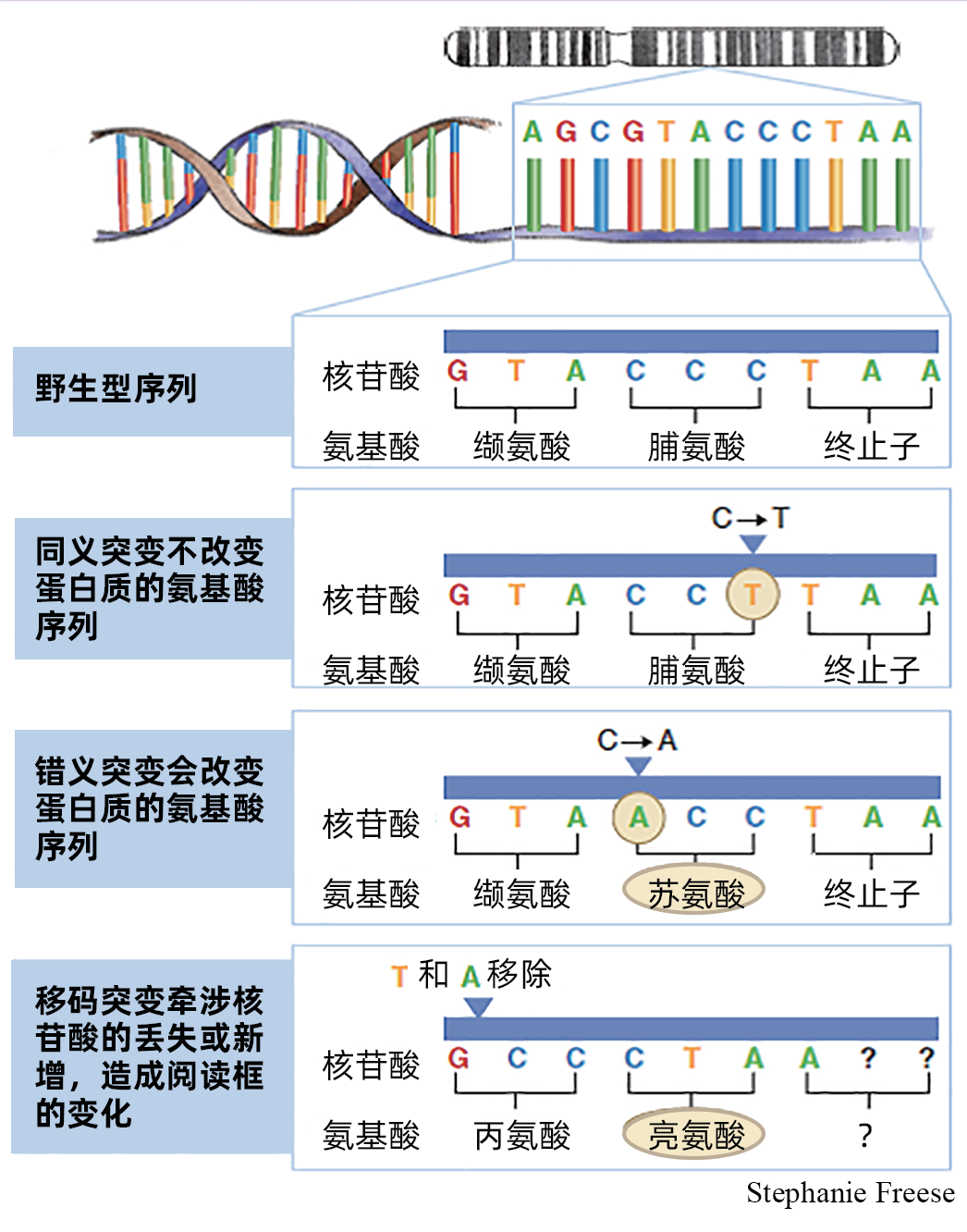 图2 DNA序列的突变。我们的遗传信息以DNA序列的形式存储在染色体中。DNA序列以双链形式存在,由4种核苷酸组成,包括腺嘌呤、胞嘧啶、鸟嘌呤和胸腺嘧啶;图中展示了自然存在或称为野生型的DNA序列。三个连续的核苷酸组成了一个密码子,编码氨基酸或者终止子。核苷酸突变可能导致密码子也就是氨基酸改变(错义突变),但不是所有核苷酸突变都会导致氨基酸变化(同义突变)。更为极端的情况下,核苷酸会丢失或者新增,造成移码突变,此时蛋白质翻译的阅读框会发生改变