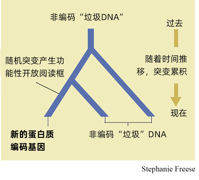 图3 一个演化树展示了从头起源新基因的产生。随机产生的突变在基因组中到处累积,也包括那些不编码蛋白质的区域。虽然通常这类突变并不会对非编码区域造成影响,但有时它们会催生一些具有蛋白编码能力的从头起源的新基因。对于相关物种间的非编码遗传序列进行演化分析,可发现新基因随着时间推移而出现