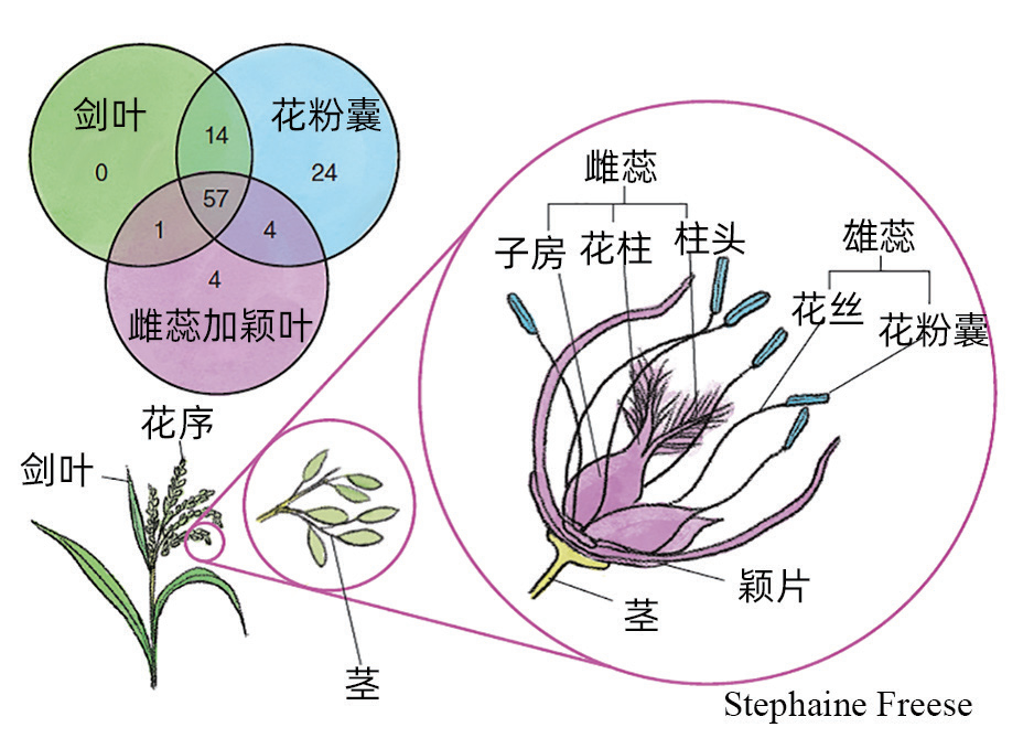 图5 从头起源新基因的表达量通常较低并且局限在少数组织,即它们的功能很可能在演化过程中进行微调。文氏图展示了从头起源新基因的蛋白产物在植物不同组织的分布。许多从头起源新基因在花粉囊特异性高表达,而花粉囊中含有花药,代表了开花植物的雄性生殖器官