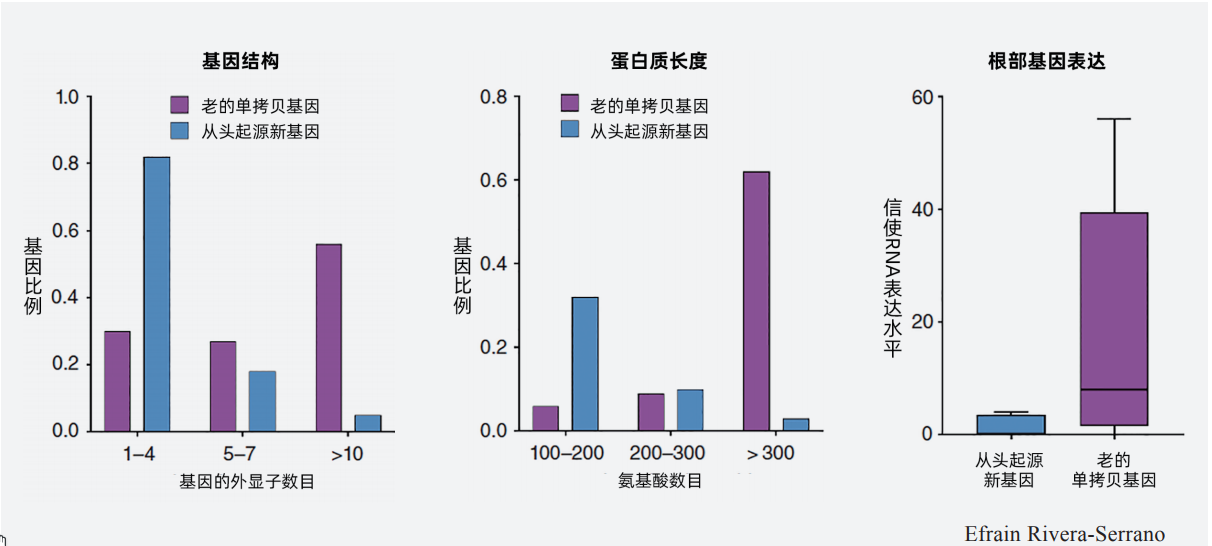 图6 与老基因相比(起源时间早于1 500万年前),从头起源新基因(起源时间最早不超过300万年)长度较短(左),编码的蛋白质也较短(中)。这些基因的表达量较低,其中仅有少数在每单位的全部转录本中转录出10条信使RNA(右)。总而言之,这些因素定义了从头起源新基因的一个逐步的构架演化过程,在此过程中扩增编码长度、复杂度、表达量
