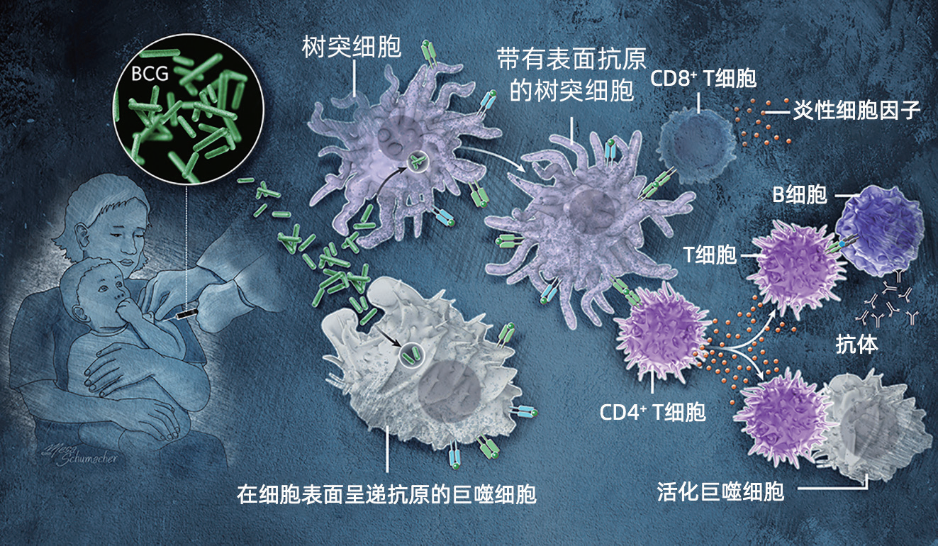 这种拥有100年历史的疫苗是一种与结核分枝杆菌(Mtb)相关的牛细菌的减毒活疫苗。接种该疫苗可将一线免疫细胞吸引到注射部位。树突状细胞和其他抗原呈递细胞会在其表面呈现卡介苗微生物的某些部分,以驱动T细胞做出应答,而T细胞应答正可对抗未来病原体的感染,并训练B细胞产生抗体。卡介苗和结核分枝杆菌都会进入被称为吞噬体的囊泡中,在那里它们互相干扰并阻止自己进行破坏。然而卡介苗最终会降解,而结核分枝杆菌却能在细胞内存活很长时间