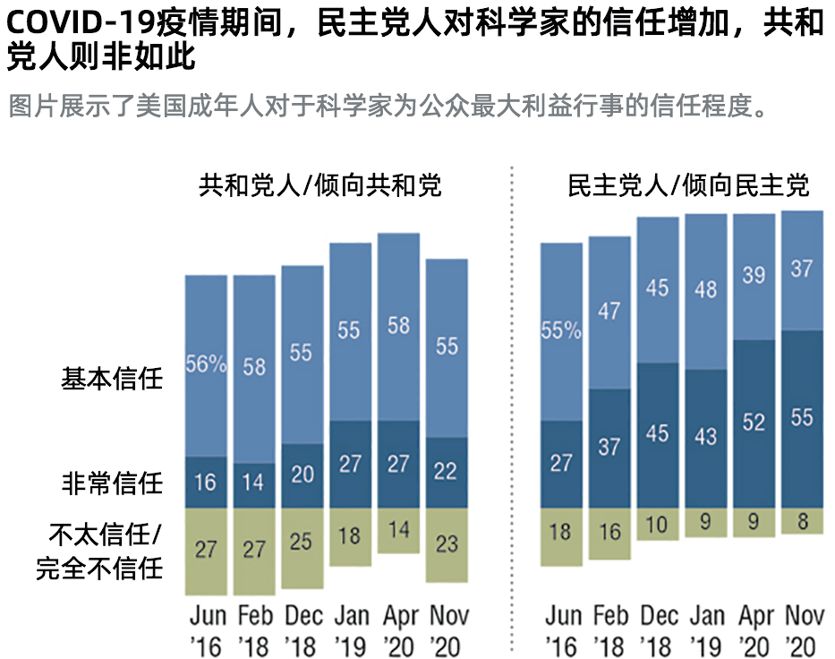 相比于公众对其他群体和机构的信任,公众对科学家的信任适度上升:同个时期公众对军人的信任保持稳定,对于记者的信任进一步下跌。不过,不同政治群体对于科学家信任的上升情况不同。民主党人和倾向支持民主党的独立人士对科学家的信任度上升,共和党人和倾向支持共和党的独立人士并非如此。在民主党人中,55%的人说他们对科学家非常信任,而共和党人中的相应数据为22%;从2019年1月开始这个由党派引起的差距已经几乎翻番。