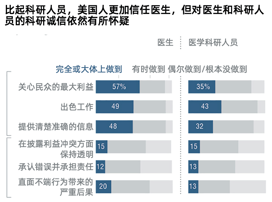 只有15%的美国人认为,医生和医学研究人员“完全或大体上做到”透明公开地披露由行业关系引起的潜在利益冲突。同样,只有小部分的公众认为医生或医学研究人员在所有时候或大多数时候会承认自己犯错并承担责任。只有不到20%的调查受访者相信,假如发生职业或科研不端行为,医学专业人士会直面不端行为导致的严重后果。