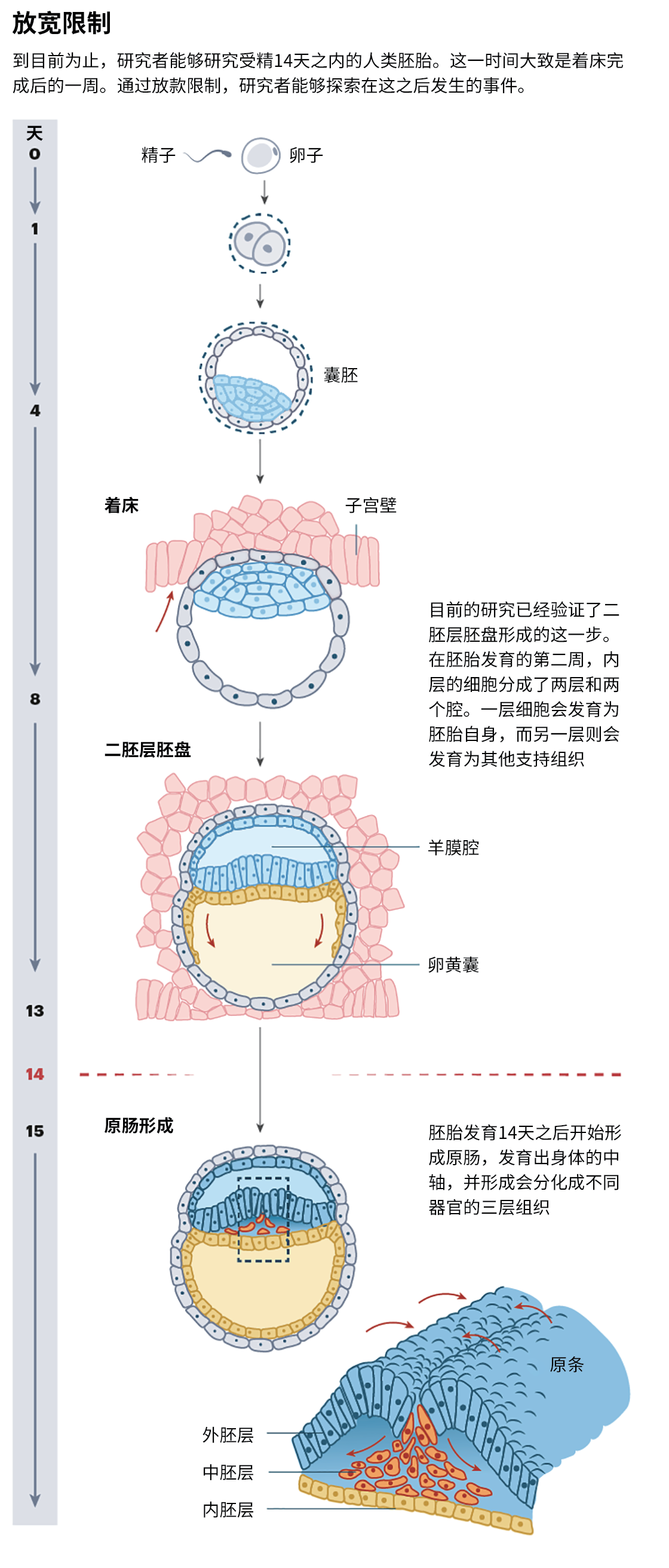 国际干细胞研究协会(ISSCR)在2021年5月发表的新指南中放宽了14天规则,移除了规则中的硬性规定。尽管全世界只有几个实验室能够充分满足培养人类胚胎14天所需的条件,但科学的进步是很快的。在一些国家中法律允许将胚胎培养至14天之后,而14天规则的松动则让这些国家的研究团队能够向监管者申请将胚胎培养至14天之后。在母体中,胚胎一般在受精一周后着床。而这些研究能够向我们展现着床之后人类胚胎的发育。在着床之后,也就是胚胎受精后大约14~22天,胚胎开始形成原肠。在这一发育阶段中胚胎大致长出了身体的形状,也为器官形成打下了基础。