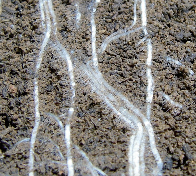 根部周围的细毛被饥饿的细菌覆盖;离根部稍远的土壤中的微生物数量可能少一个数量级