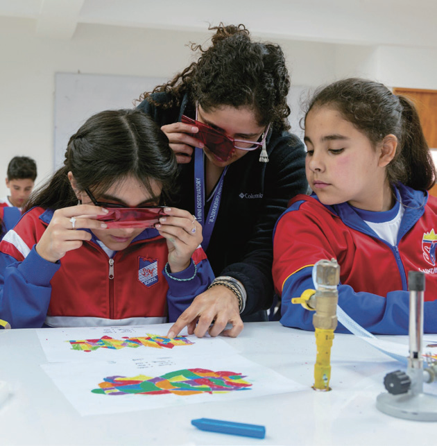 智利双子星天文台的费尔南达·乌鲁蒂亚(Fernanda Urrutia)和儿童一起做滤色器实验。加州大学伯克利分校的劳伦斯科学展厅通过“数学和科学大探险”项目发起这个活动