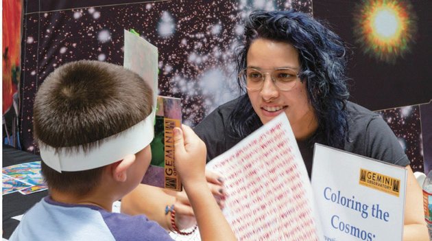 诸如天文日或全国天文周之类基于社群的教育活动是将科学活动带给广泛受众的有效方式。2019年在夏威夷州希洛的库希欧王子广场购物中心举办的这项活动中,来自双子星天文台的一位职员和一名学生一起探究滤色器。天文台在活动中联系当地社群,了解他们的教育需求