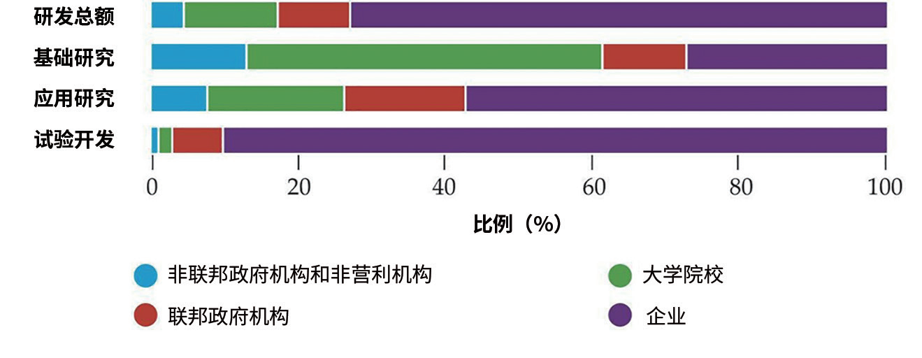 图1 在美国,大多数研发工作由私营企业完成,然而这其中大部分都是应用研发工作,而大部分基础研究由非营利机构、学术机构和政府研究机构完成