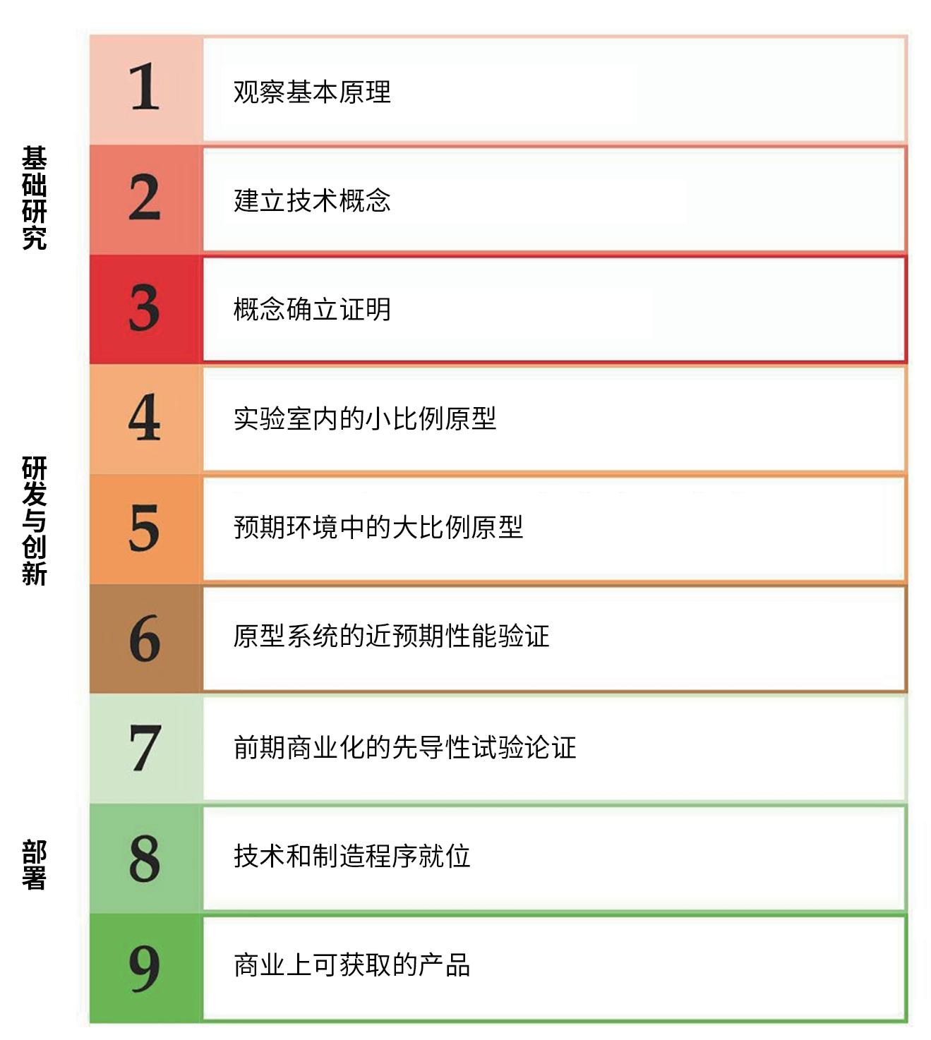 图4 一个创新的技术成熟度可以用技术就绪指数(TRL)来描述。低技术就绪指数(1~3)的研究通常在大学进行,由基金会和联邦政府的拨款资助。高技术就绪指数(7~9)的技术研发工作常常由商业公司资助。创业企业可以帮助弥合这些不同发展水平之间的差距