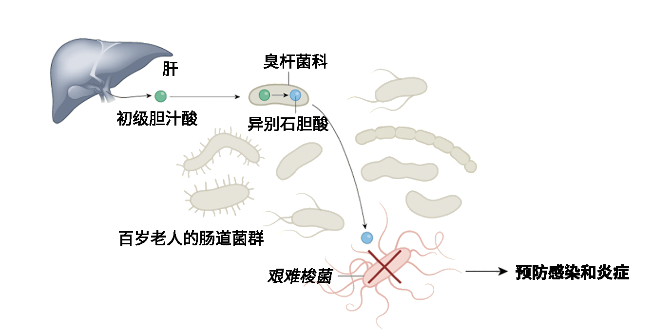 作者探究了异别石胆酸对肠道微生态的影响,同时也研究了异别石胆酸对包括艰难梭菌在内的特定有害细菌的影响。艰难梭菌是一种革兰氏阳性菌,能导致严重的腹泻和肠炎。作者发现异别石胆酸能够抑制革兰氏阳性菌的生长,在实验室实验中确认其对艰难梭菌的生长有着显著的抑制作用。作者认为,那些能够产生异别石胆酸的细菌可能能够通过异别石胆酸的抗菌作用促进和维持人体肠道内环境稳定,从而对那些百岁老人们的健康老化起到积极作用。当前我们需要进一步的研究来明确异别石胆酸在人体内起到预防感染、促进健康作用的机制,异别石胆酸对人体的其他直接影响也需要进一步研究。