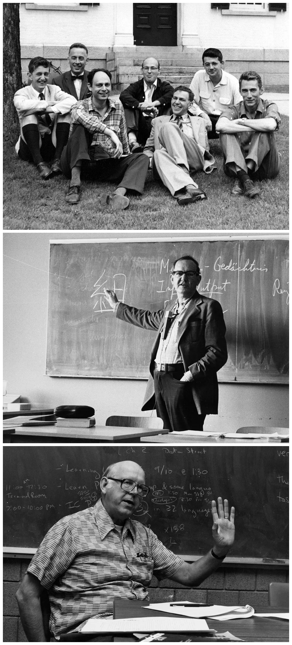 人工智能领域的研究开始于1956年的一次研讨会(上),从左到右依次为:奥利弗·塞尔弗里奇(Oliver Selfridge)、纳撒尼尔·罗切斯特(Nathaniel Rochester)、雷·索洛莫诺夫(Ray Solomonoff)、明斯基,以及研讨会组织者麦卡锡和克劳德·香农(Claude Shannon)。西蒙(中)和纽维尔(下)等符号主义专家想把有关世界的规则教给人工智能