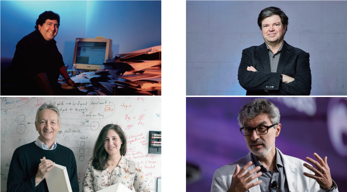 无论是莱纳特(左上)研究的Cyc等符号人工智能项目,还是由辛顿(左下)、杨立昆(右上)和本吉奥(右下)开创的深度学习所获得的进展,都尚未产生人类水平的智力