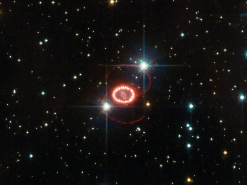 在这张哈勃空间望远镜于2011年拍摄的照片中,SN1987A周围环绕着数个发光环