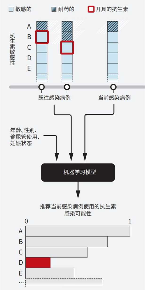 一个机器学习模型中储存着上千例尿路感染和伤口感染患者的信息。机器学习模型能够基于此识别与复发感染病原菌耐药性有关的因素。机器学习模型能够将患者的传染病病史及抗生素治疗史与人群数据相结合,预测出防止出现复发感染的最佳的抗生素