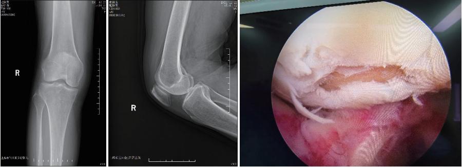 王阿姨右膝关节X线检查和关节镜检查。X线检查诊断右膝骨性关节炎,关节镜下可见内侧股骨髁有大片软骨缺损