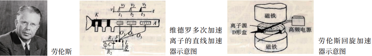 劳伦斯设计出了新型的加速器——回旋加速器。加速器采用了适当的磁场装置,用了两个电极,它的工作原理并不复杂:两个金属D形盒置于真空室中,两盒之间施以高频电压,离子源处于两D形盒的中心,均匀磁场垂直加于盒的平面。由于盒内无电场,离子在盒内空间受洛伦兹力作匀速圆周运动,只有在两盒间的空隙才受电场作用。如果电场方向的改变恰好与离子运动的周期合拍,就有可能在每次通过间隙时加速。随着速度的增加,离子作圆周运动的半径也将逐步增大,最后从窗口逸出。