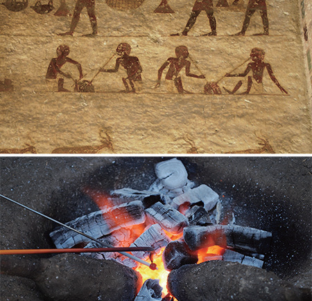 画中的两名金属工匠用管子向火焰吹气(上);研究人员模仿画中人以管吹火的方式,尝试制造阿马尔纳同款玻璃珠(下)