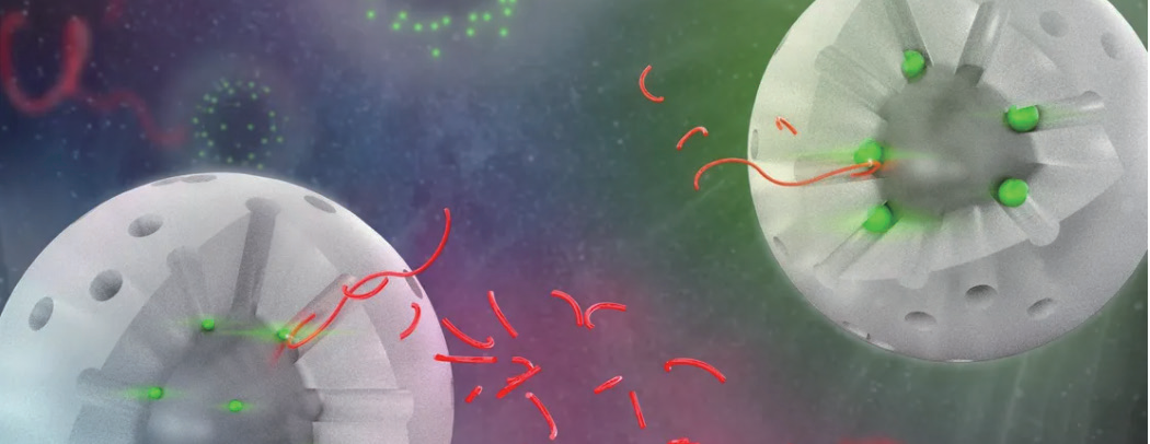 正在分解塑料的催化剂的示意图。白色球壳代表介孔二氧化硅壳,上面分布着大小均一的孔隙。内核上的小球体代表催化位点,左侧那些小球体的尺寸比右侧的小得多,代表铂纳米颗粒的大小差异。较长的细条代表催化前的聚合物长链,较短的细条是催化后的产物。所有较短细条在尺寸上都差不多,意味着不同型号催化剂的选择性是一致的。较小的催化剂位点则产生了更多的短细条,它们的催化速率更快