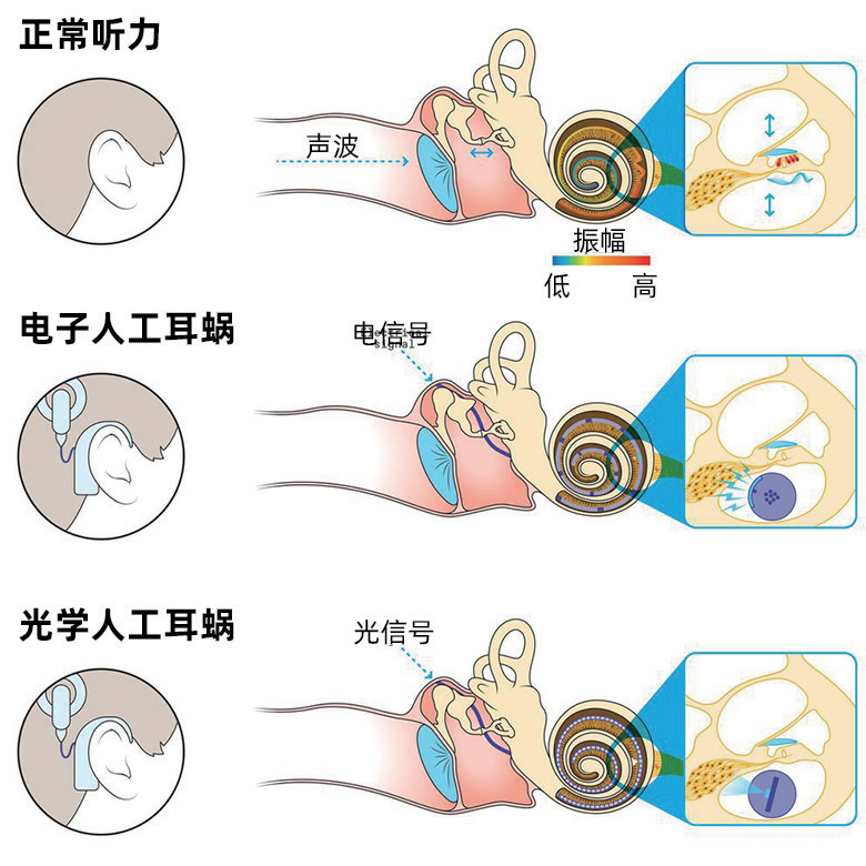 人类的听力取决于内耳中的一个蜗牛状结构,即耳蜗(cochlea)。现在,一种新型光学人工耳蜗植入物被用于辅助听力丧失者,其运作原理是通过光束刺激耳蜗神经