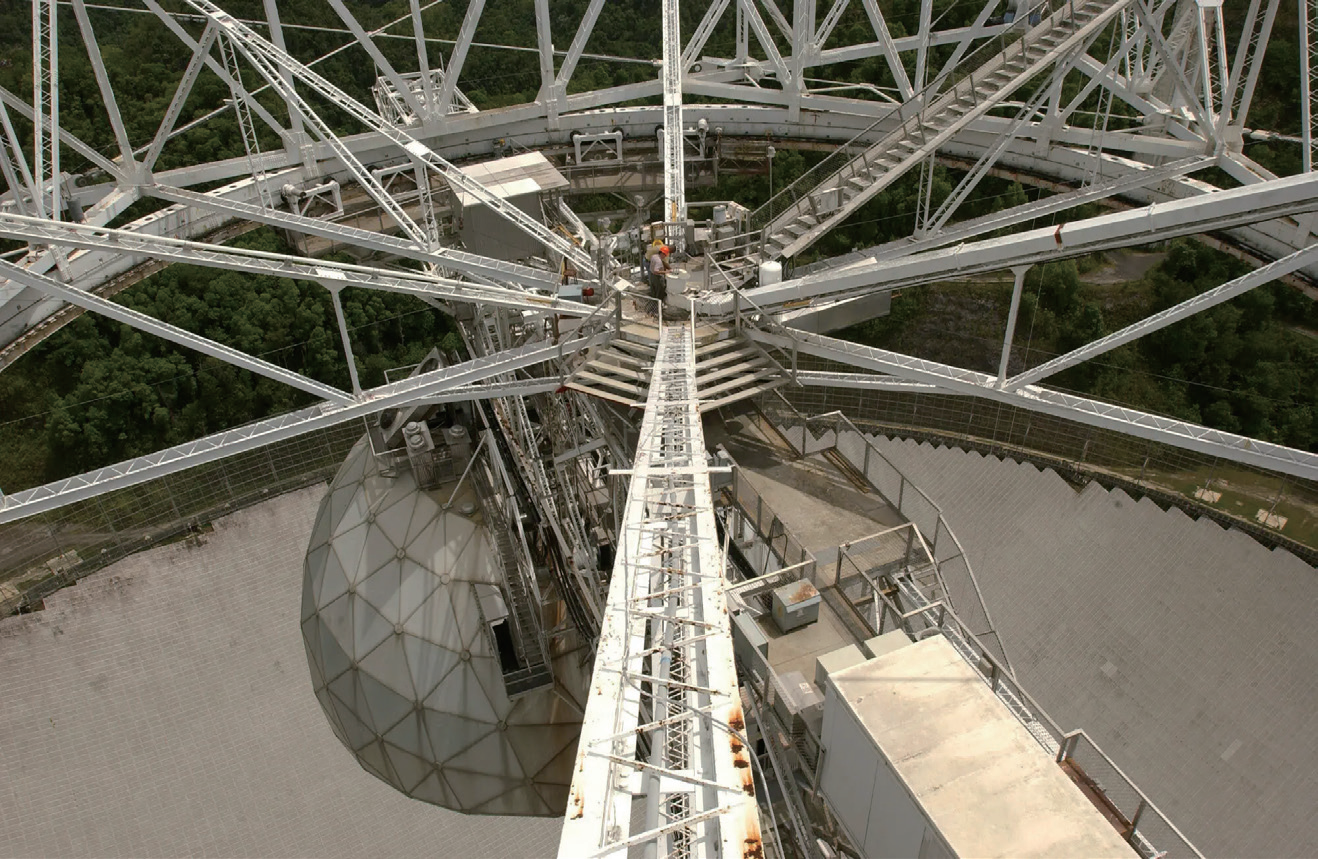 2003年7月,维修工人站在阿雷西博望远镜上方的天线阵列上。当时,这架望远镜还是全球最大的射电望远镜