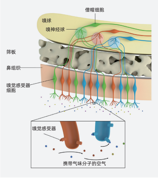 进入鼻腔的气味分子与嗅觉感受器细胞结合,嗅觉感受器细胞发送信号,穿过筛板,抵达嗅球。信号再从嗅球传送给大脑