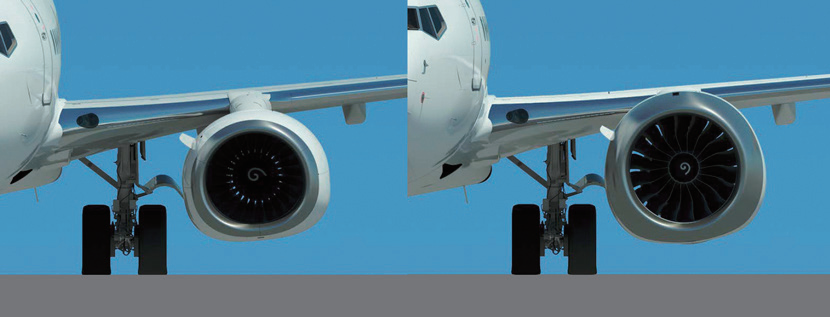 最初的波音737于1967年首飞,经历了近60年的设计。事实证明,在解决了最初一些设计上的小问题后,该型号的飞机是最受欢迎的双引擎客机。2018年,第10 000架737飞机从华盛顿州伦顿的波音公司生产车间下线,由发动机制造商CFM国际公司的CFM56涡扇发动机驱动,其风扇直径为60英寸(1英寸为2.54厘米)。涡扇发动机的功率和燃油效率由所谓的旁通比决定,旁通比就是从发动机周围绕过的空气量与通过发动机的空气量之比。CFM56的旁通比为5:1。 737型客机的引擎机舱进口底部形状是扁平状的,这种设计考虑的是能够使其利用较大的发动机,同时保持必要的17英寸滑行离地间隙。航空业给这种发动机扁平状的开口起了一个绰号——“仓鼠嘴”。