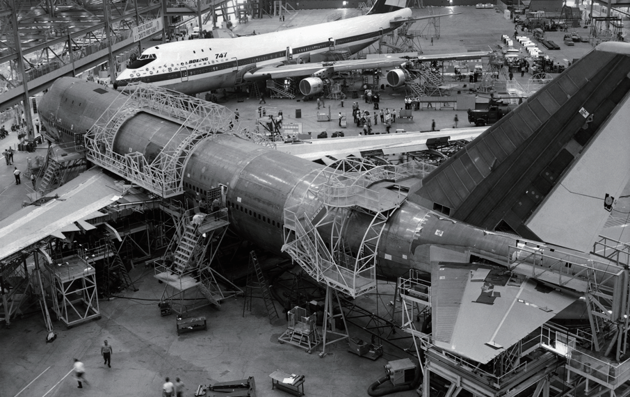一张1969年10月的照片显示了在华盛顿埃弗雷特的波音工厂组装的第一批波音747飞机。由于发动机外壳变形问题导致叶片磨损,以及推力和燃油效率降低,生产被推迟。这个问题通过开发Y形框架来修复,该支架可稳定发动机箱并防止形状变形