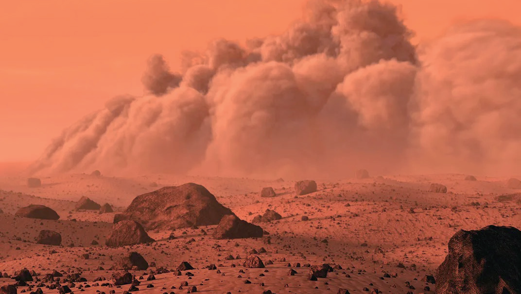 就像这张照片展示的一样,火星上的沙尘暴可以包裹整个星球,其中的颗粒以高达每小时110千米的速度呼啸飞行