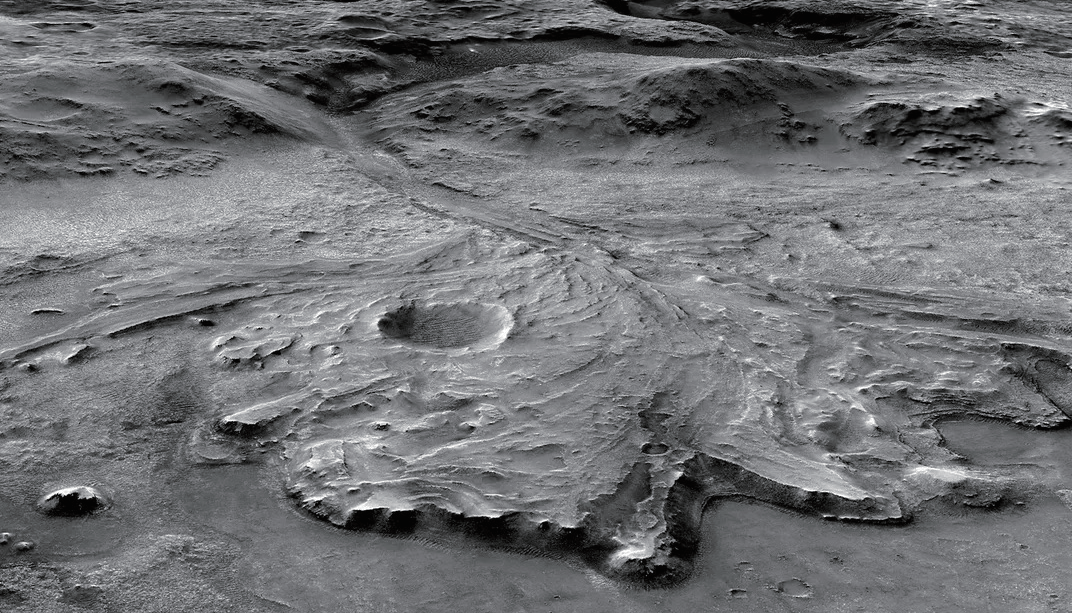 科学家根据火星勘测轨道飞行器拍摄的多幅照片重建的耶泽洛陨石坑内的一处他们感兴趣的地点画面。这里的地貌看上去就像是从河流中渗出的泥土——这表明这一地区过去可能存在流动的水。自2021年以来,毅力号火星车始终在探索这一区域