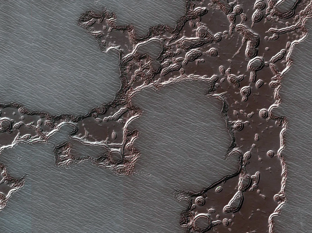 火星南极冰盖融化并在表面上形成凹坑时,会呈现类似瑞士奶酪的外观