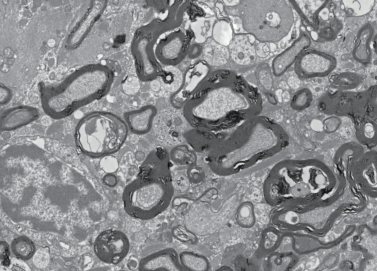电子显微镜显示,ALSP患者脑白质中轴突周围的髓鞘过度生长。髓鞘失稳与最终退行性改变是神经退行性疾病的特征
