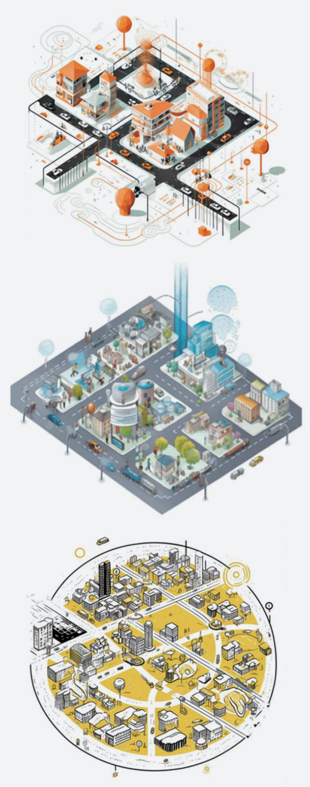 我发现,使用 AI图像生成器提供了比绘图软件更多的创意自由,但没有准确地描绘出智慧城市中复杂的相互联结。图像有力地呈现了许多单独元素,但在展示信息流和交互作用时并不成功。图像生成器无法理解背景信息,也无法呈现联系。