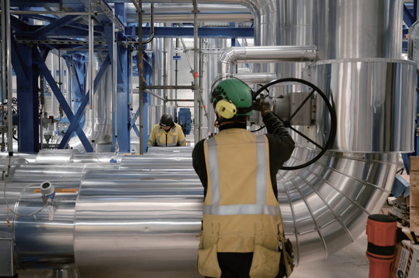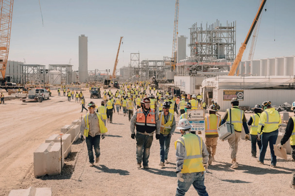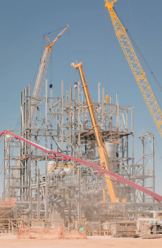 现在,西方石油公司表示,他们在坚持石油生产方定位的同时也在努力朝着“碳管理”公司的方向转型。一家叫作“碳工程学”的初创企业开发了一种从空气中抽取二氧化碳的方法。2023年,西方石油公司为这项技术支付了11亿美元,并且启动了斯特拉托斯项目的建设工程。不到12个月前,这里还是一片荒芜的土地,而现在已经成了一座熙熙攘攘的繁忙工地。