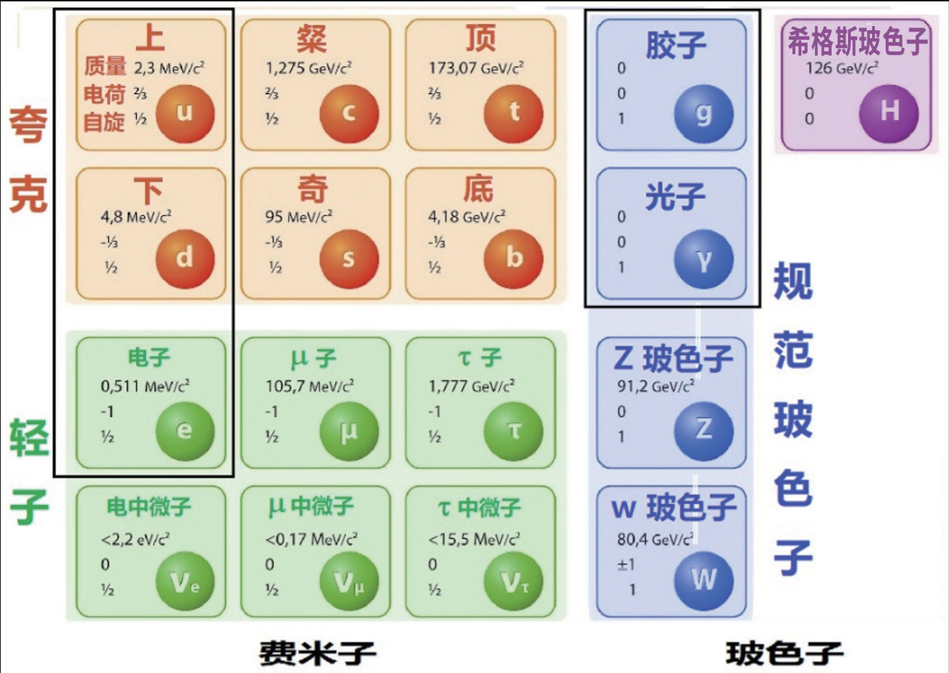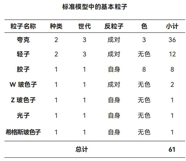 标准模型理论框架中包含两类基本粒子:一类是作为物质基本组成的费米子,另一类则是传递相互作用的玻色子。标准模型中包含着61种(不含尚未发现的引力子)基本粒子。强子是复合粒子,包括介子(由1个夸克和1个反夸克组成)和重子(由3个夸克或3个反夸克组成)两大类,重子又分为质子、中子和超子三类。渐近自由和夸克禁闭理论认为不存在自由夸克。规范玻色子是指参与相互作用的4类媒介粒子,共有13种:胶子(gluon)有8种;光子γ;W+,W-,Z0;引力子g。量子电动力学(QED)、量子色动力学(QCD)和量子味动力学(QFD)分别用于描述电磁相互作用、强相互作用和电弱统一理论。1954年杨振宁和罗伯特 · 米尔斯(Robert Mills)发现的定域规范场论是标准模型的重要基石。科学家追求的终极目标是把4种相互作用都统一起来,力图建立起理论物理学的圣杯——万有理论(即万物理论,ToE)。