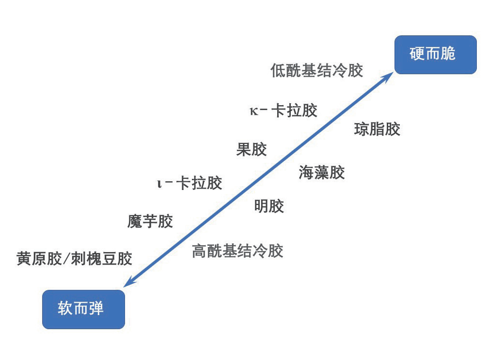 不同化学结构和分子链构象的多糖可以产生不同力学性能的凝胶。如低酰基结冷胶、琼脂胶和κ-卡拉胶凝胶坚硬而脆,明胶、高酰基结冷胶和由黄原胶与植物多糖混合形成的“协同”凝胶则柔软而有弹性,而海藻酸盐和果胶形成的凝胶性质介于上述类凝胶之间。